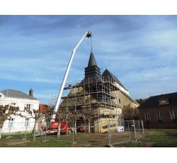 - Catégorie « En action avec nacelle » : Emmanuel DELAFORGE de la société DELAFORGE COUVERTURE avec une photo prise lors de la pose du coq à l’église de Fresneaux Montchevreuil (60) avec sa grue K21-31 TSR.